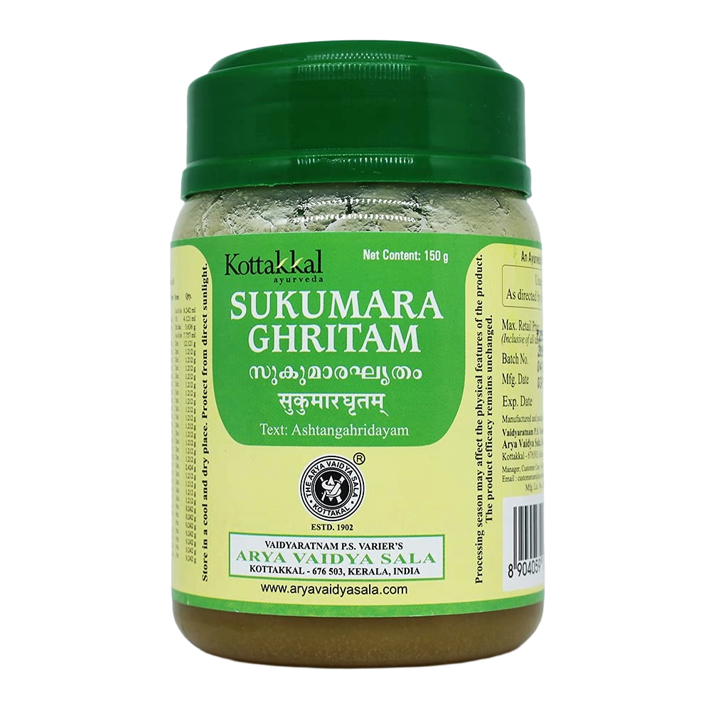 Sukumara Ghritam is a classical Ayurvedic medicated ghee formulation known for its wide-ranging health benefits, particularly in supporting female reproductive health, digestive wellness, and overall vitality. This herbal remedy is especially beneficial for menstrual discomfort, PCOS, delayed or painful periods, abscesses, hernia, constipation, and other abdominal disorders. Made with cow’s ghee and nourishing herbs like Punarnava, licorice, ashwagandha, and guduchi, Sukumara Ghritam helps regulate hormonal balance, relieve pain, boost immunity, and rejuvenate the body.